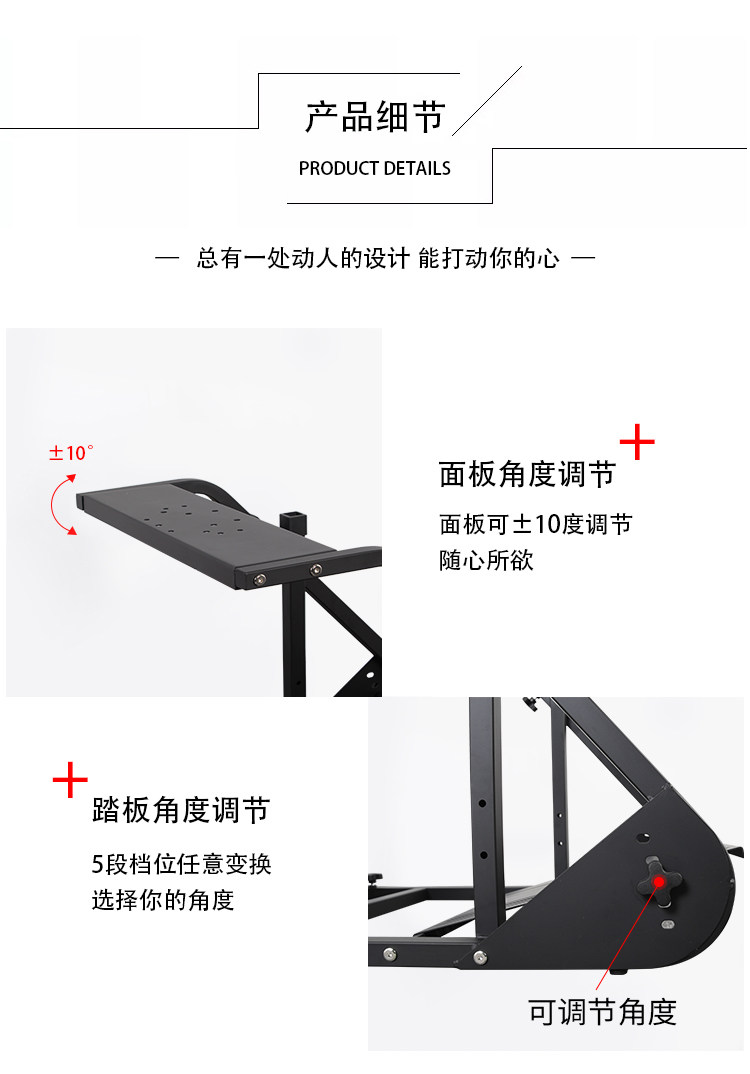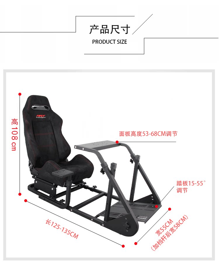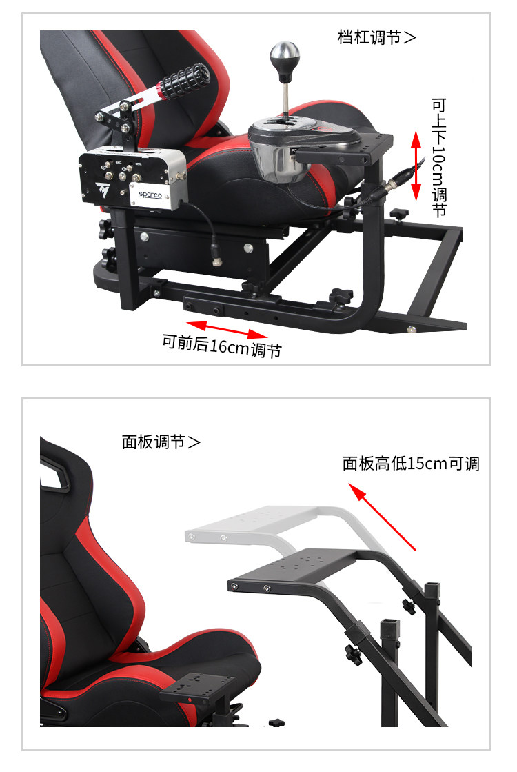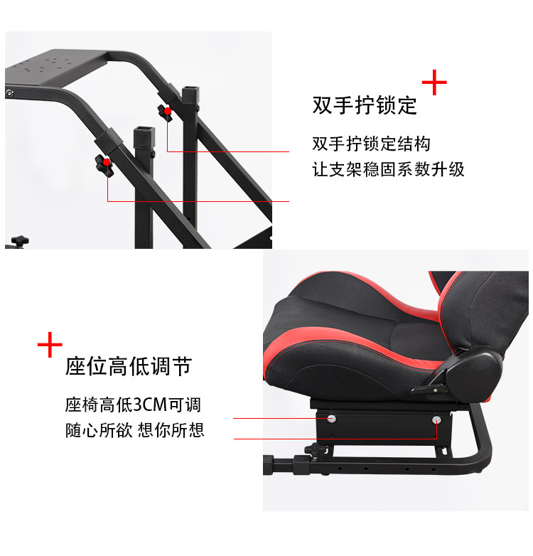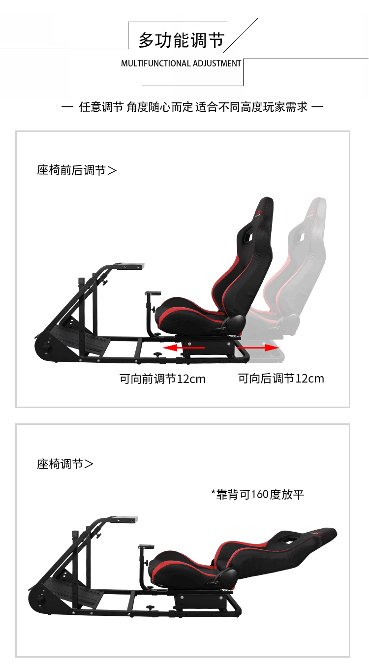 组装简易,方向盘高度及踏板前后,角度都可调节。